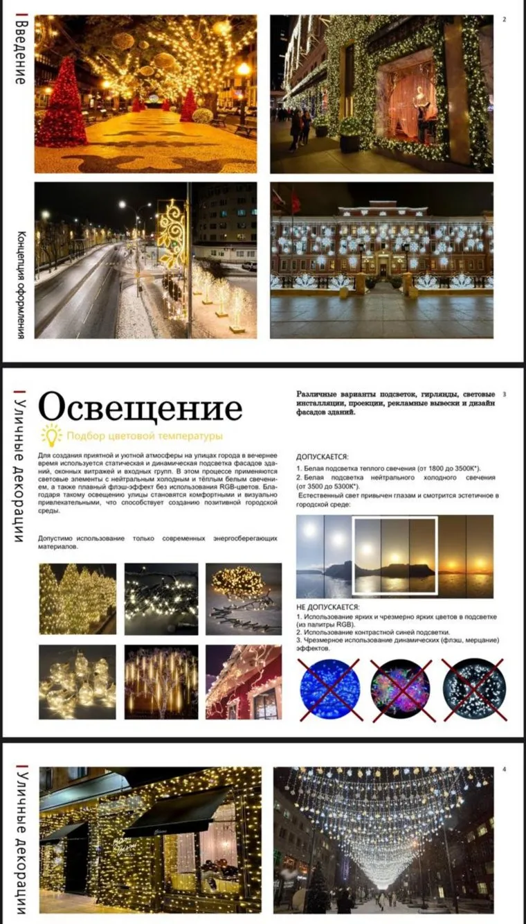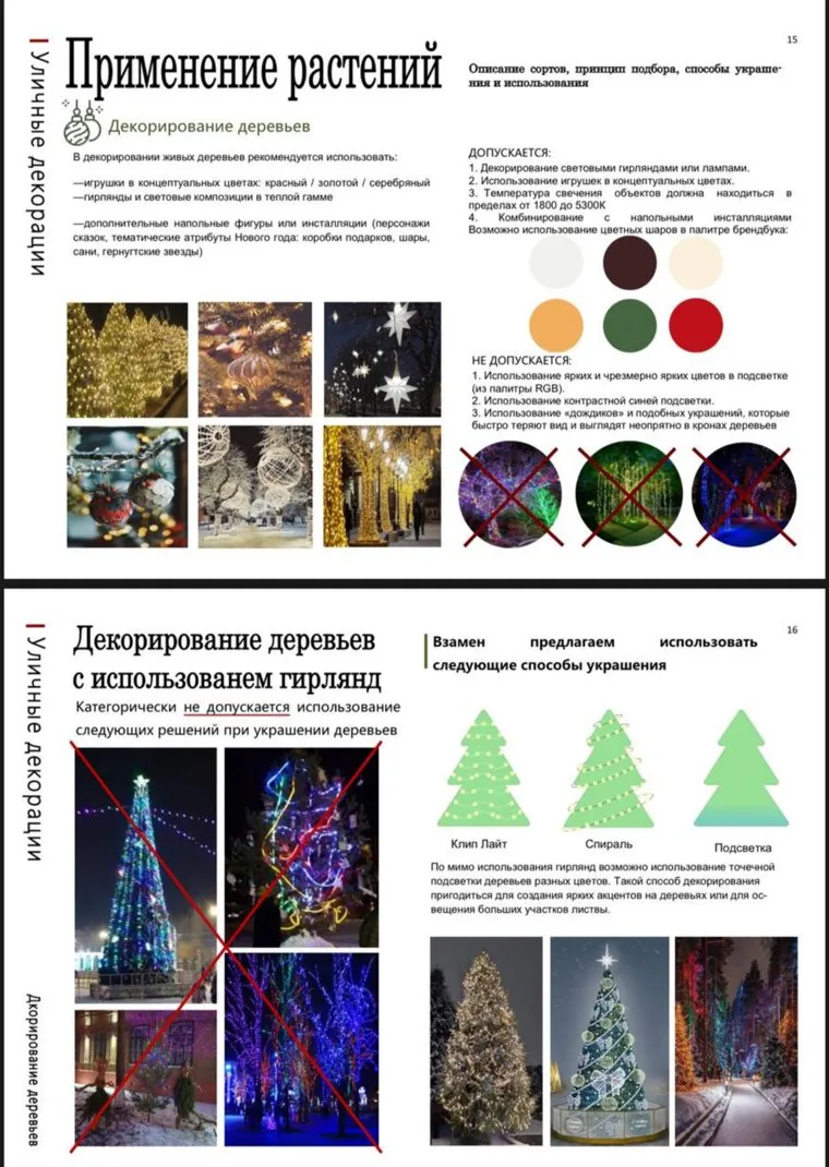 Как указано в рекомендациях, новогодние украшения должны быть выполнены в одном стиле и цвете. Есть ограничения на использование ярких цветов. Разрешены только желтые и белые цвета для подсветки гирлянд. Запрещены украшения, быстро теряющие вид, и контрастная синяя подсветка. Всего в единую палитру входят шесть разрешенных цветов.