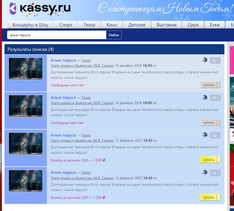 «Челябинцы активно раскупают билеты на спектакль „Алые паруса“. Его впервые сыграют на сцене челябинского театра. Свободных мест на 13 и 14 декабря уже не осталось», — сообщает корреспондент.