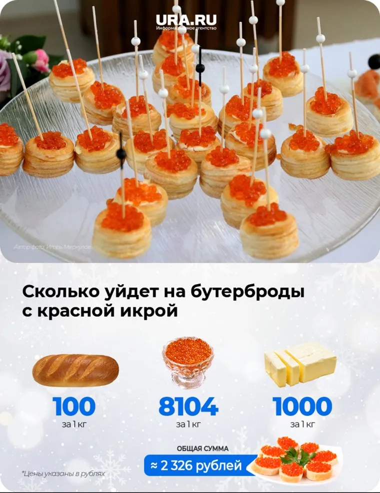 Закуски с красной рыбой и икрой традиционно занимают особое место на новогоднем столе, символизируя праздник не меньше, чем классические салаты. В этом году стоимость красной икры в России достигла отметки в 8104 рублей за килограмм в 25 российских регионах, самая высокая цена наблюдалась в Крыму. К тому же длительное время в стране наблюдалось повышение цен на еще один неотъемлемый ингредиент новогодней закуски — сливочное масло — средняя цена составляет около 1000 рублей. Средняя цена хлеба по России — около 100 рублей.