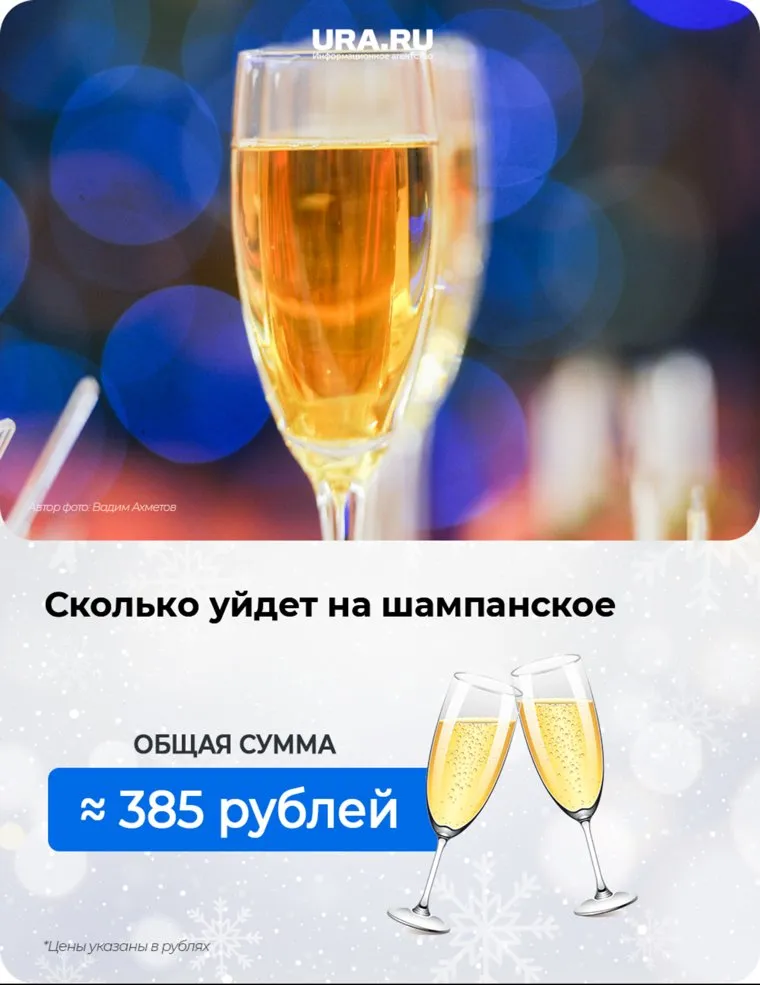 Стоимость этих игристых вин в магазинах составляет от 700 до 4000 рублей за бутылку. Цена шампанского за год — выросла до 385 рублей за бутылку против 349 рублей годом ранее, цена на бутылку вина составила 458 рублей (ранее — 410), а коньяк теперь стоит 733 рубля против прежних 683.