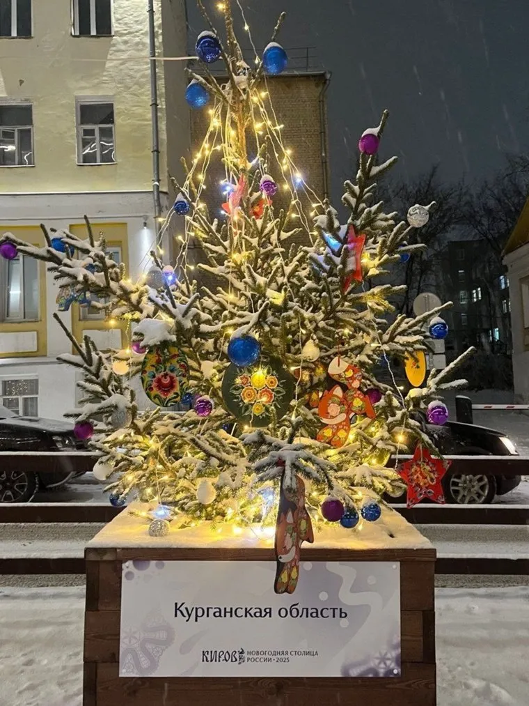 «Именную елку Курганской области установили в Кирове, который в этом году выбран „Новогодней столицей России“. На Спасской улице Кирова стартовал фестиваль елок России: кировчане и гости города увидели более 100 „именных“ лесных красавиц — их нарядил каждый регион», — пишет telegram-канал ведомства.