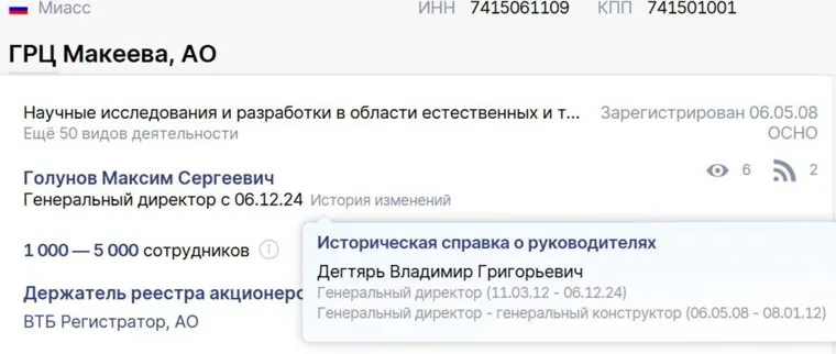 Информация подтверждается в базе данных СБИС. Там указано, что в АО «ГРЦ Макеева» с 6 декабря генеральным директором стал Максим Голунов. Дегтярь указан в исторической справке в качестве генерального директора центра с 11 марта 2012 до 6 декабря 2024 года. В базу Федеральной налоговой службы изменения внесены также 6 декабря 2024 года. В строке руководители указан Максим Голунов.
