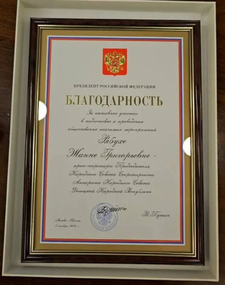«За активное участие в подготовке и проведении общественно значимых мероприятий», — говорится в опубликованном Рябухой документе. Награду ей присвоили еще за работу в ДНР.