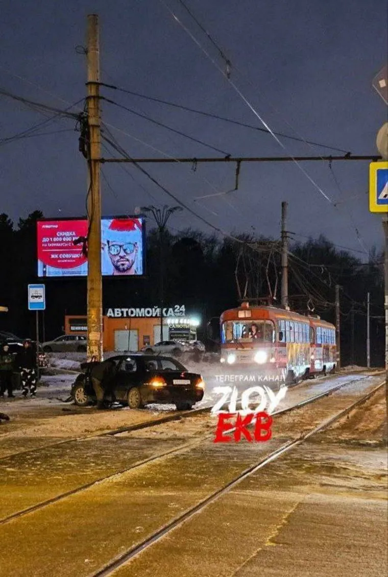 Влетевший в столб водитель заблокировал движение трамваев в Екатеринбурге. Фото