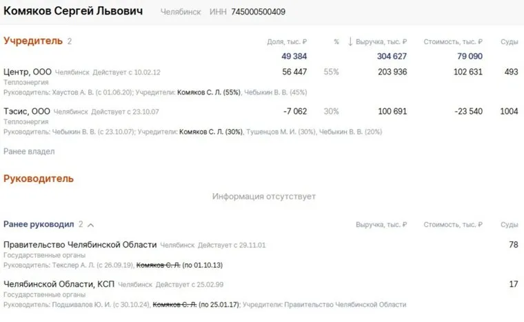 Главный актив Комякова и его пасынка Максима Тушенцова — теплоэнергетическая компания «Тэсис», дела которой давно оставляют желать лучшего. В отличие от ООО «Центр» аналогичного профиля — с выручкой более 200 млн рублей и стоимостью бизнеса в 102,6 млн рублей. Также Тушенцов ведет совместный коммунальный бизнес с Владимиром Ветховым, отцом действующего депутата гордумы Кирилла Ветхова.