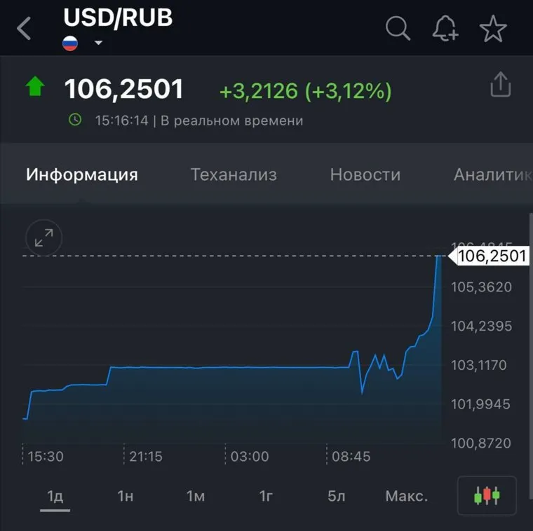 По данным платформы investing com, курс доллара преодолел отметку в 106, 25 рублей. Ранее уровень американской валюты находился на отметке в 101 рубль.