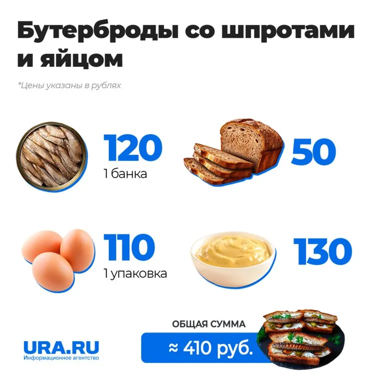 Вареное вкрутую яйцо нужно разрезать на кусочки и выложить на хлеб, смазанный майонезом. Затем на бутерброд добавляются шпроты — и закуска всего за 410 рублей готова.