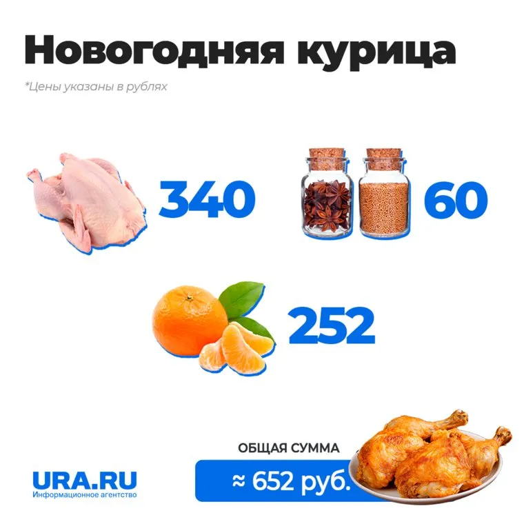 Чтобы придать курочке новогодний вкус, можно запечь ее с мандаринами. Для подсчета возьмем цену за килограмм — в рецепте понадобятся всего две штуки, а остальные пойдут на стол. Итого, для новогодней курочки, нужно купить: