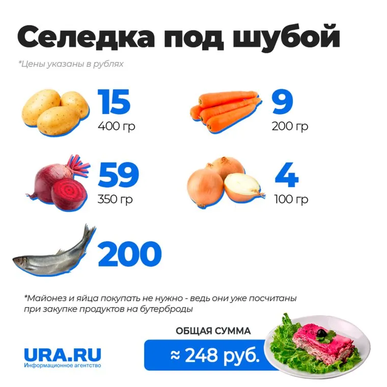 Картофель, морковь и свекла отвариваются отдельно. Затем все продукты нарезаются кубиками и выкладываются слоями: сначала идет сельдь, затем лук, картофель, морковь, яйца и свекла. Каждый слой смазывается майонезом. Выходит очень вкусное и знакомое всем новогоднее блюдо за 248 рублей.