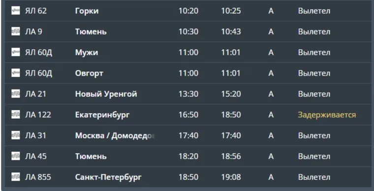 «Задержан рейс ЛА 122 в Екатеринбург», — указано в онлайн-табло аэропорта Салехарда. Самолет должен был вылететь в 16:50.