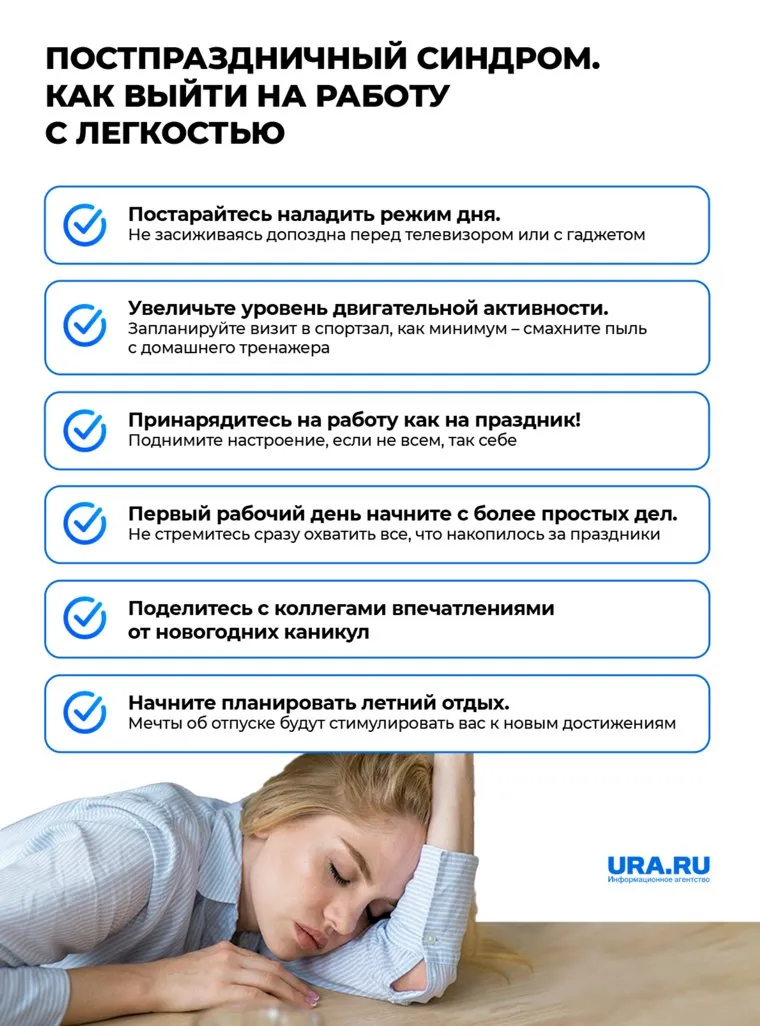Главный врач Центра общественного здоровья и медицинской профилактики, доктор медицинских наук, а также главный внештатный специалист департамента здравоохранения ЯНАО по медицинской профилактике Сергей Токарев отметил, что в первый рабочий день после длинных выходных некоторые люди чувствуют вялость, апатию, сонливость и даже раздражение при виде коллег.