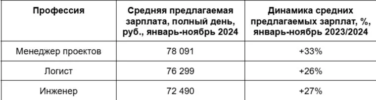 «Лидером рейтинга в уходящем году стала профессия менеджера проектов. В среднем работодатели предлагали кандидатам около 78 091 рубль в месяц за полный рабочий день. Это на 33% больше по сравнению с 2023 годом», — сообщили в пресс-службе.
