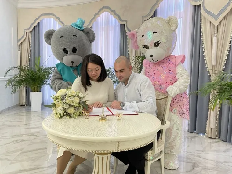 Необычный подарок в виде ростовых кукол плюшевых мишек для новобрачных подготовила мама невесты. Пара познакомилась в Киргизии шесть лет назад. Тогда будущая невеста приехала туда на отдых к родственникам.