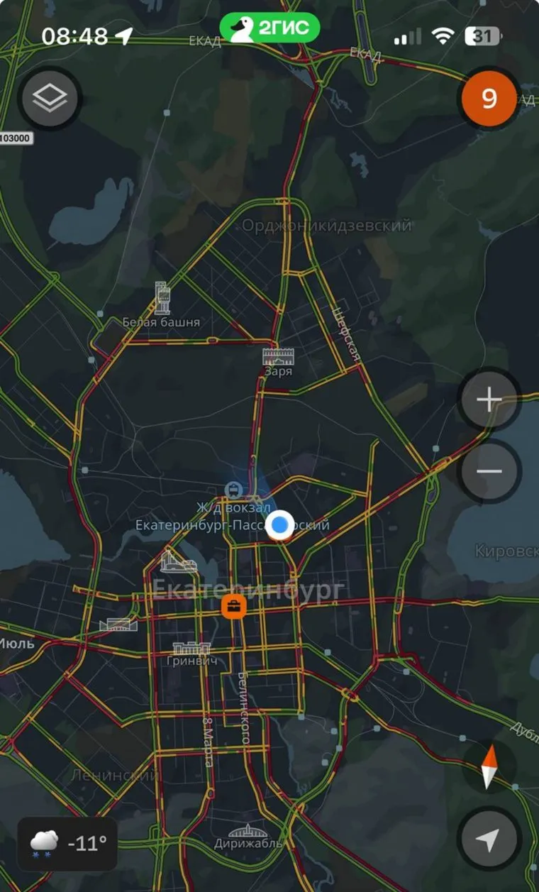 В Екатеринбурге утром 16 декабря образовались девятибалльные пробки — на фоне новых осадков и упущений в уборке города, которая была в выходные. Проблемы с движением на дорогах фиксирует сервис 2GIS.