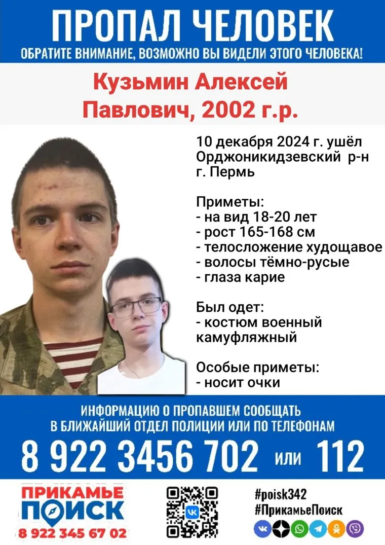 «Алексей Кузьмин пропал 10 декабря. Последний раз его видели в Орджоникидзевском районе. Был одет в камуфляжный военный костюм», — следует из ориентировки поискового отряда «ПрикамьеПоиск». Изданию 59.RU удалось узнать, что он служит в Пермском военном институте и там не знают, где находится Кузьмин.