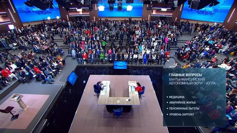 «Главные вопросы, Ханты-Мансийский автономный округ — Югра. Медицина, аварийное жилье, пенсионные льготы, уровень зарплат», — сообщается на трансляции.