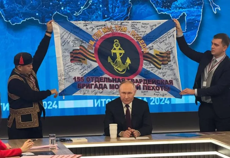 Бойцы морской пехоты передали свое боевое знамя президенту России Владимиру Путину. Российский лидер показал его во время прямой линии.