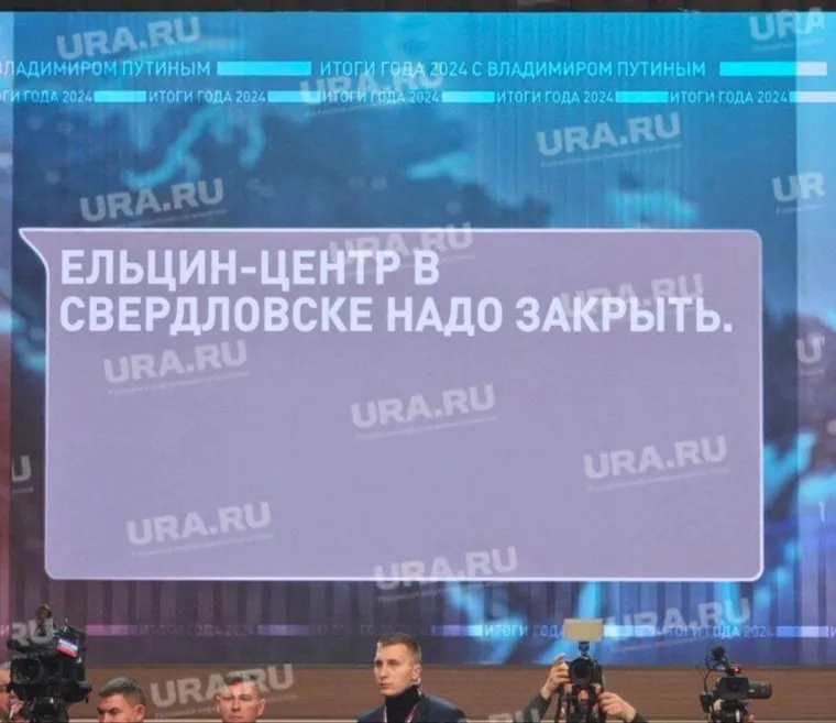 Во время прямой линии президента России Владимира Путина поступила просьба закрыть Ельцин Центр «в Свердловске». Сообщение транслировалось на большом экране за спиной главы государства.