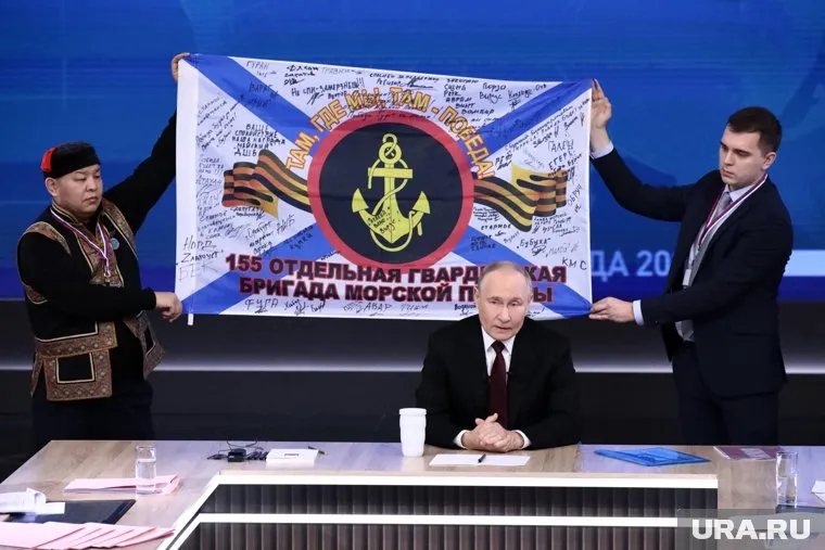 Владимир Путин представил копию знамени 155-й морской бригады, которую ему подарили сами солдаты
