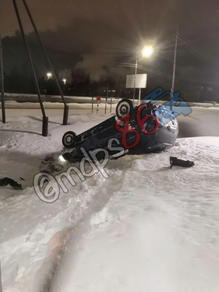 В Сургуте после ДТП легковушка улетела в кювет и перевернулась на крышу. Фото, видео