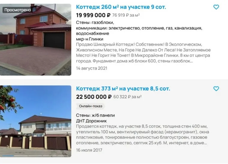 Чуть дешеле, за 26 500 000 рублей, выставлен на продажу коттедж в ДНТ Ежик площадью 360 квадратов. Год постройки — 2016. Хозяева указывают на дизайнерский ремонт. Но уже через пять лет, в 2021 году, роскошный для жизни объект появился на популярном сайте объявлений, где и значится до сих пор.