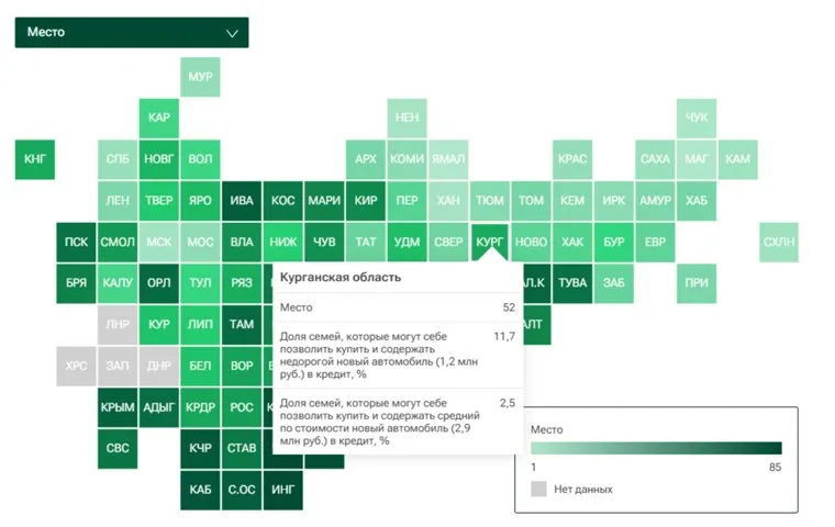 «В Курганской области доля семей, которые могут себе позволить купить и содержать недорогой новый автомобиль (1,2 млн рублей) в кредит составляет 11,7%», — сказано в исследовании РИА Рейтинг. По доступности покупки нового автомобиля Курганская область заняла 54-е место в России. Первое место досталось Ямало-Ненецкому автономному округу.