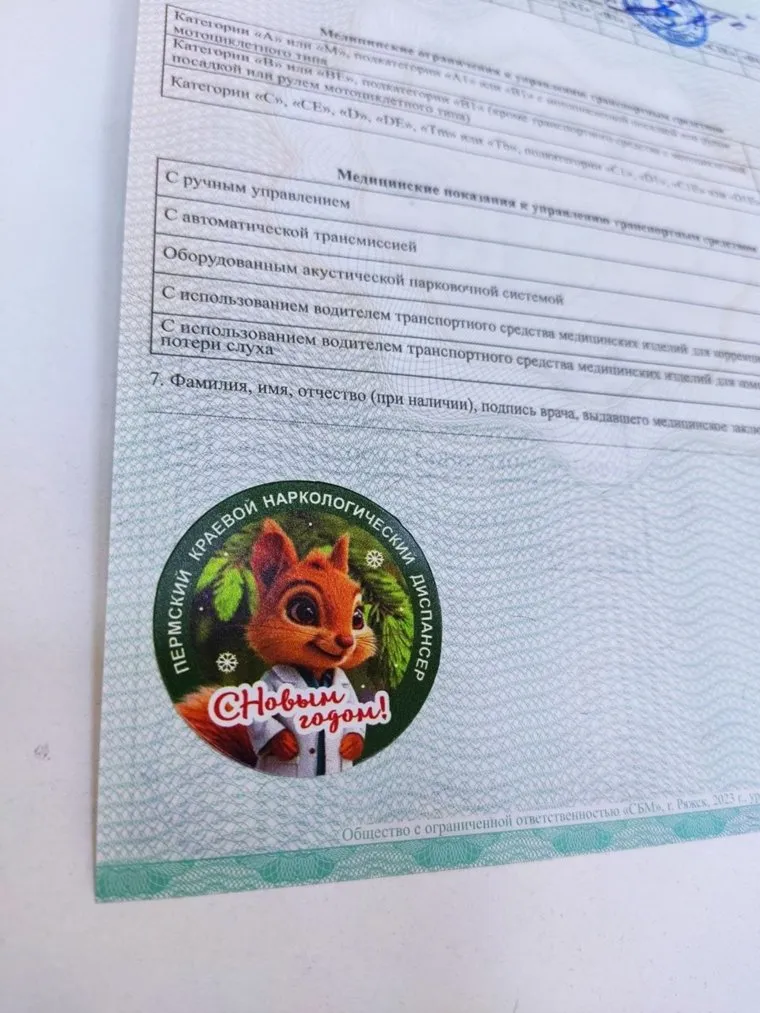 «Граждан, прошедших водительскую комиссию в нашем диспансере, ждет сюрприз. На справках, подтверждающих отсутствие заболеваний, препятствующих вождению автомобиля, появятся праздничные стикеры», — сообщается на странице диспансера в соцсети «ВКонтакте». На стикере изображен бельчонок.