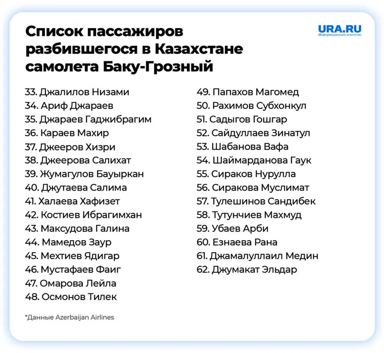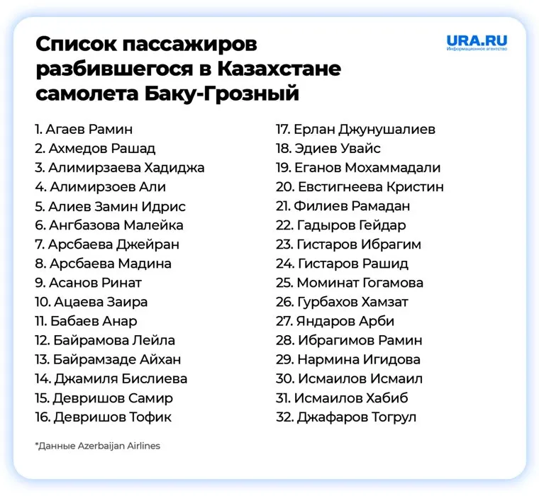 14:34 Azerbaijan Airlines опубликовала список членов экипажа разбившегося в Казахстане самолета: