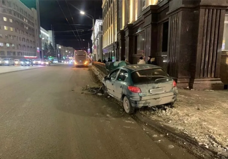 В центре Челябинска иномарка залетела на тротуар и впечаталась в забор. Фото