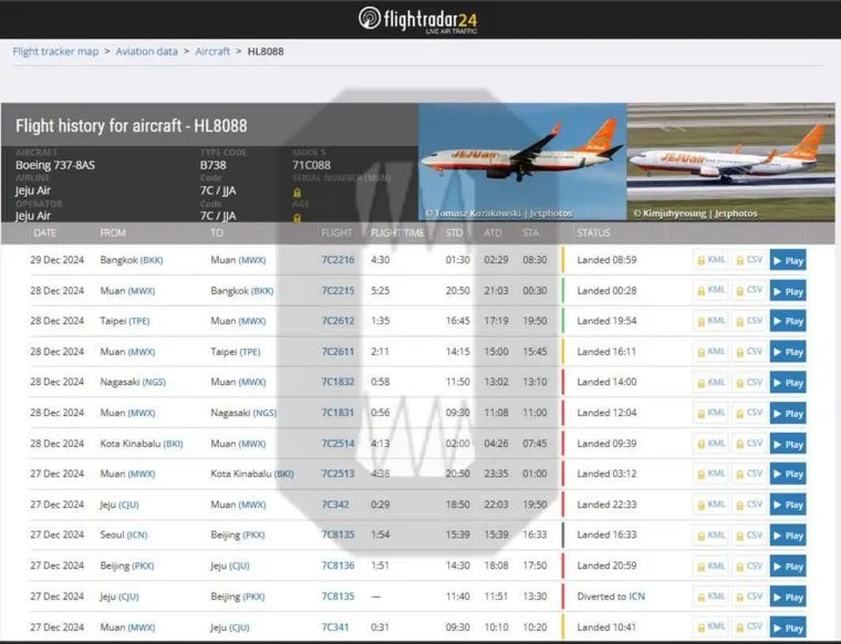 Boeing 737-8AS, следовавший из Чеджу в Пекин, сообщал о внештатной ситуации на борту еще 28 декабря. В связи с этим самолет был вынужден совершить посадку в Корее. Об этом свидетельствуют данные Flightradar.