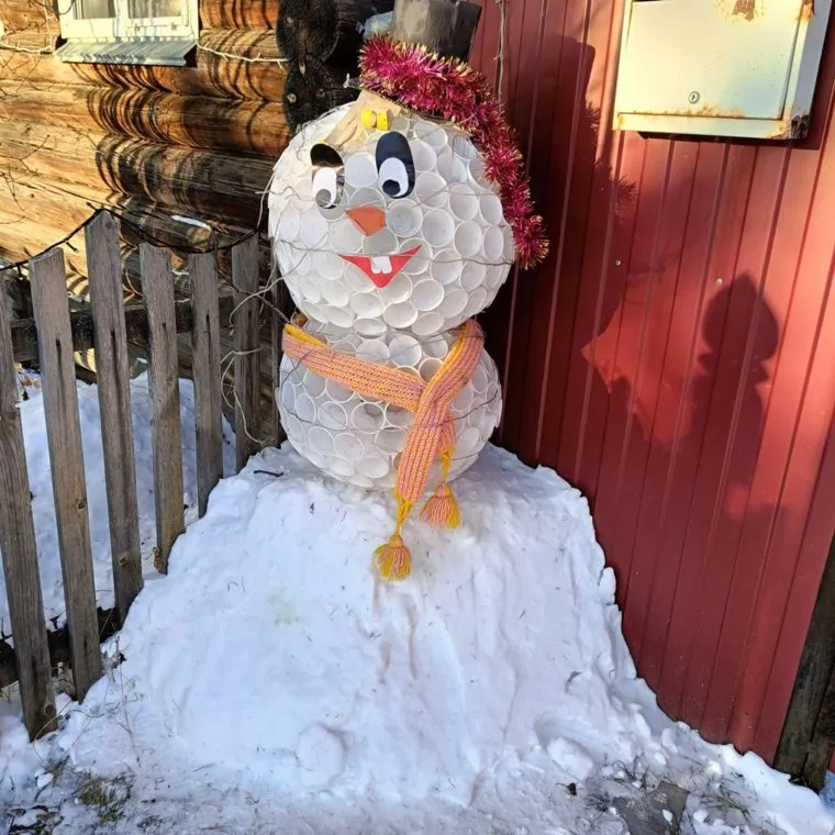 В селе Большое Банниково Каргапольского района был замечен снеговичок, которого хозяева соорудили из пластиковых стаканчиков и установили на снежном пьедестале. Они заботливо укутали его шарфиком и нарядили мишурой. Фото прислала читательница URA.RU Елена Малышко.