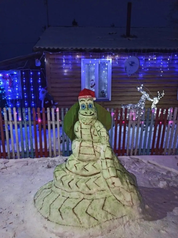 Символ 2025 года — забавную снежную змейку слепили жители Белозерского округа. Фигура в новогоднем колпачке украшает территорию возле жилого дома, который хозяева тоже тщательно нарядили.