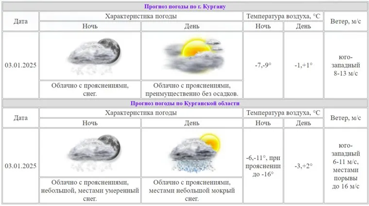 «Прогноз погоды по городу Кургану: ночью облачно с прояснениями, снег, температура воздуха -7,-9. Днем облачно с прояснениями, преимущественно без осадков, температура воздуха — 1, +1. Ветер юго-западный 8-13 метров в секунду», — указано в прогнозе ЦГМС.