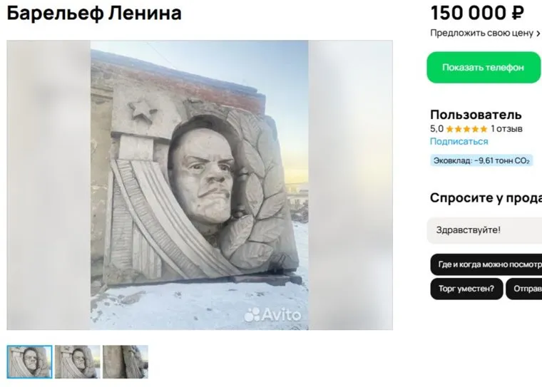 «Продам барельеф Ленина. Изготовлен из бетона. Вес 14 тонн», — говорится в предложении на сайте «Авито». В сообщении уточняется, что товар уже был в использовании.