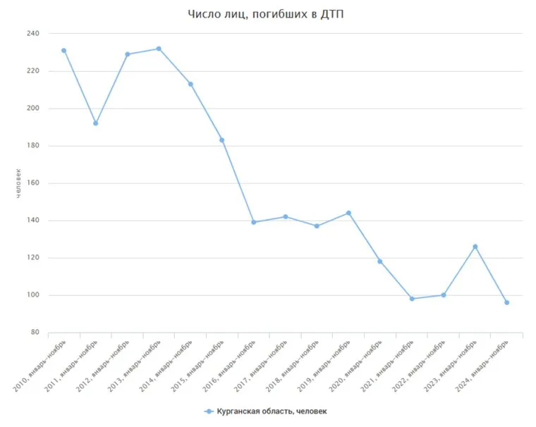 «С января по ноябрь 2024 года в Курганской области число лиц, погибших в ДТП 96. В 2023 году за аналогичный период 126 человек», — говорится на сайте ЕМИСС. За 14 лет количество смертей сократилось в 2,4 раза.