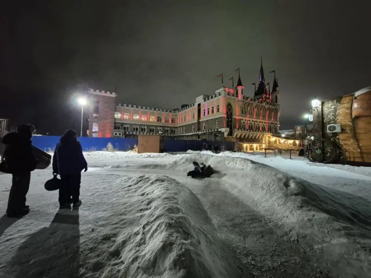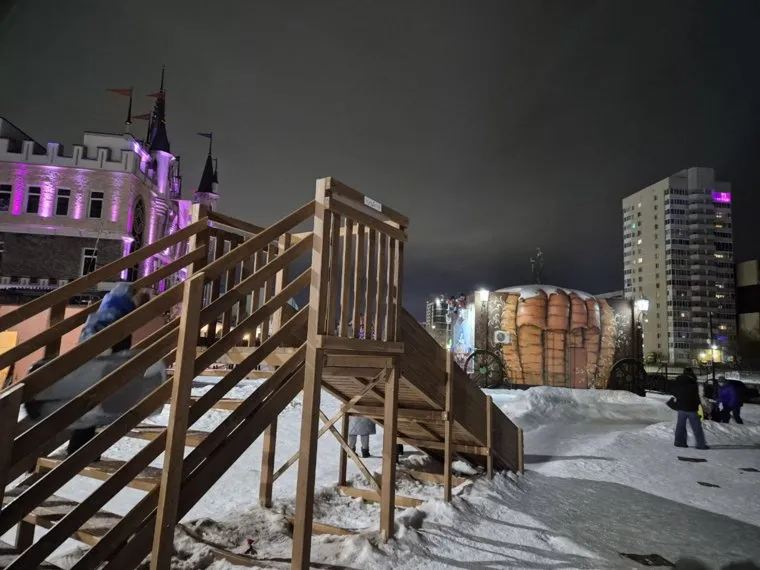 «Деревянную горку поставили на территории замка кондитерской фабрики „Каприз“ в первом микрорайоне. Горку полили водой, а от нее продлили желоб из снега. Получилась горка с небольшим трамплином и закруглением», — пишет канал.