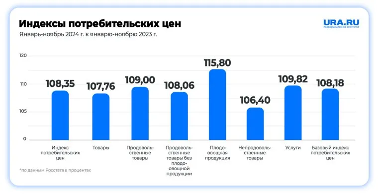 На конец 2024 года экономическая ситуация в России характеризовалась значительным ростом цен, что вызвало обеспокоенность среди экспертов и населения. По данным Росстата, за период январь-ноябрь 2024 года, по сравнению с аналогичным периодом 2023 года, общий индекс потребительских цен вырос на 8,35%. Это показывает, что общая инфляция в России за первые 11 месяцев 2024 года была довольно значительной. В целом цены на товары выросли на 7,76%. Это ниже, чем общий индекс потребительских цен — по данным Росстата, в ноябре 2024 года он составил 1,43% по сравнению с ноябрем 2023 года (8,09%).