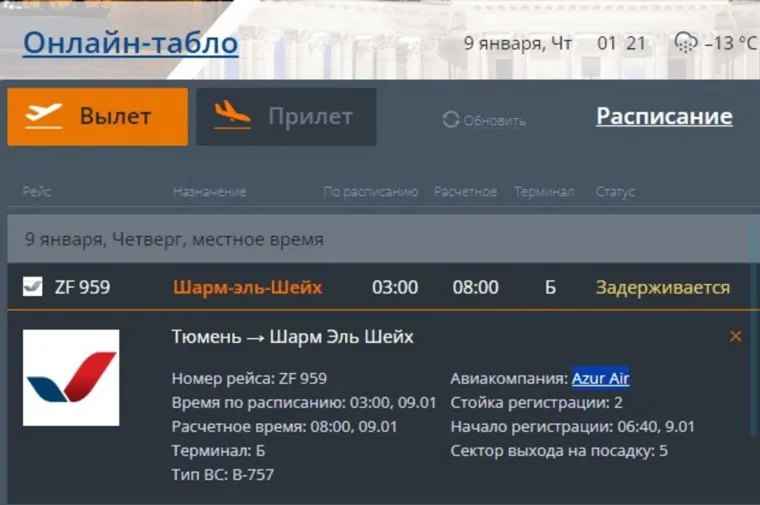 «Вылет самолета авиакомпании Azur Air по маршруту Тюмень — Шарм Эль Шейх 9 января задерживается. Врем вылета по расписанию 3:00, расчетное время — 8:00», — следует из данных онлайн-табло тюменского аэропорта.
