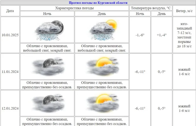 «В Курганской области ночью 10 января ожидается температура до одного градуса. Днем прогнозируется мокрый снег и порывы ветра до 18 метров в секунду», — указано на сайте Курганского ЦГМС.