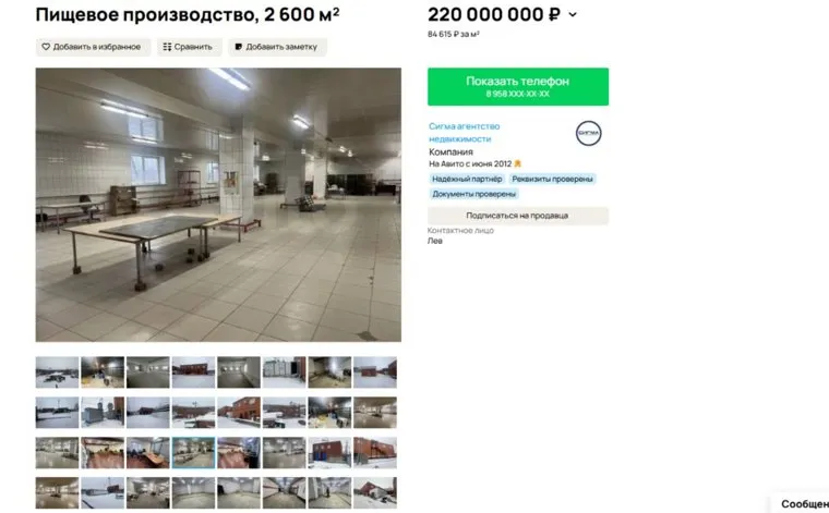 Продавец отмечает, что комбинат включает колбасный цех на двух этажах, производственные и офисные помещения, холодильные и морозильные камеры. Имеются склады и гараж более 300 квадратных метров с смотровой ямой. Объект располагает необходимыми коммуникациями, включая подстанции, водоснабжение и охранные системы.