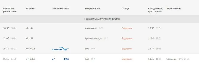 По данным онлайн-табло аэропорта вылета, задерживается еще один рейс до Уфы авиакомпании «Красавиа». Его вылет перенесен с 15:30 10 января на 16:15 11 января.
