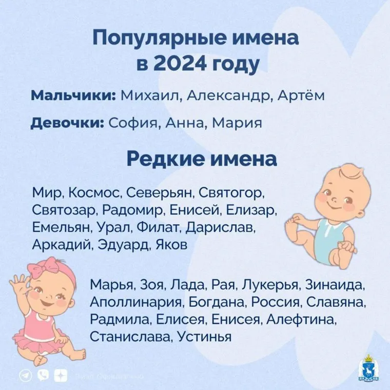 В ЯНАО самыми популярными именами 2024 года для новорожденных мальчиков стали Михаил (117), Александр (103), Артем (89), Дмитрий (81) и Лев (81). Среди имен девочек лидируют — София (88), Анна (88), Мария (84), Ева (76) и Василиса (70).