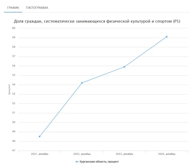 В Курганской области в декабре 2024 года выросла доля граждан, которые систематически занимаются физкультурой и спортом. Этот показатель достиг 59,1%. Такие данные приводит Министерство спорта России на сайте государственной статистики.