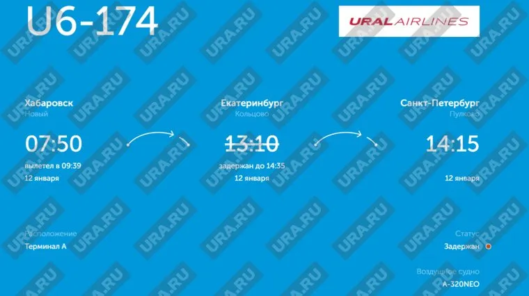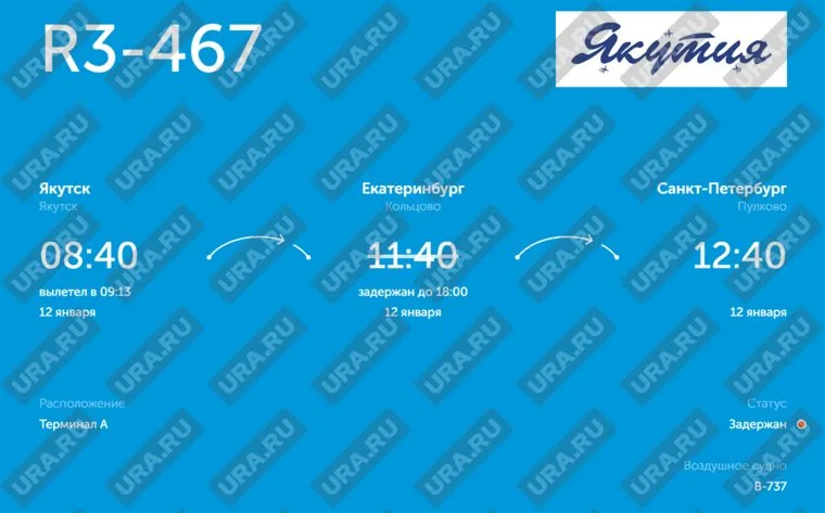 Самолет Airbus-320 «Уральских авиалиний» должен был вылететь из Екатеринбурга в Санкт-Петербург 12 января в 13:10 по местному времени. Вылет Boeing-737 авиакомпании «Якутия» перенесли с 11:40 до 18:00 по уральскому времени.