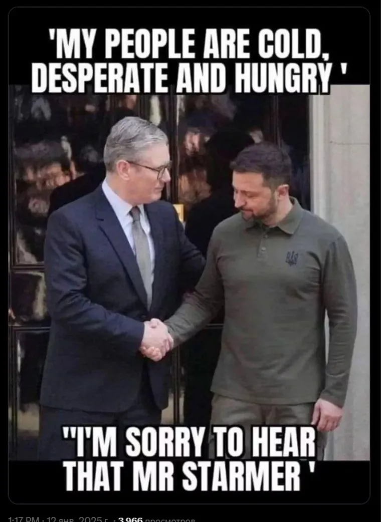 Боуз в соцсетях разместил фотографию, на котором Стармер и Зеленский пожимают друг-другу руки. Напротив британского премьера надпись: «Мои люди отчаялись, они замерзают и голодают». Читатель должен предположить, что это слова Зеленского, однако мем строится на сломе ожиданий. «Мне очень жаль это слышать, мистер Стармер», — гласит следующая надпись от лица самого Зеленского.