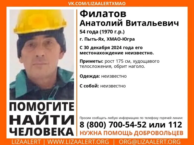 «Внимание! Помогите найти человека! Пропал Филатов Анатолий Витальевич, Пыть-Ях, ХМАО-Югра. С 30 декабря 2024 года его местонахождение неизвестно», — гласит информация в группе югорской «ЛизаАлерт» во ВКонтакте.