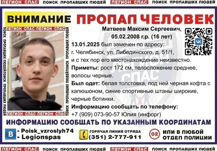 Пропал Матвеев Максим Сергеевич 2008 года рождения. 13 января был замечен в районе улицы Либединского, дом 51/1. С тех пор его местонахождение неизвестно«, — сообщают поисковики в группе „Легион-СПАС“ — поиск пропавших детей Челябинск» в «ВК».