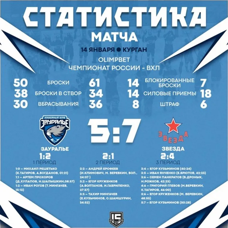 «Старались, боролись, но допустили несколько ошибок и в сверхрезультативном матче ХК „Зауралье“ уступил „Звезде“. Счет игры 5:7 в пользу москвичей», — сообщается в telegram-канале клуба из Кургана.
