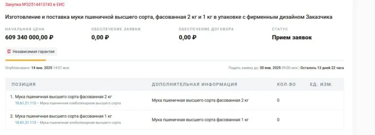 Холдинг планирует закупить 16 000 тонн готовой муки за 609 340 000 рублей до конца 2025 года. Продукция должна быть фасована в пачки по одному или двум килограммам. На упаковку необходимо нанести фирменный дизайн заказчика, говорится в условиях закупки. Заявки на участие в тендере принимаются до 30 января. Итоги будут подведены 4 февраля в Москве.
