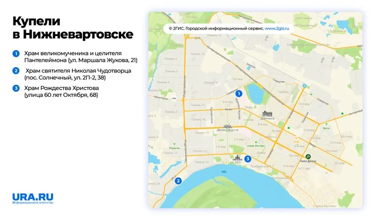 В Нижневартовске будет три купели. Первая — у храма Рождества Христова (ул. 60 лет Октября, 68). Вторая — у храма святителя Николая Чудотворца (поселок Солнечный, 2П-2 Западный промышленный узел, д.38). Еще одна расположится на территории храма великомученика и целителя Пантелеймона (ул. Маршала Жукова, 21). Ознакомиться со списком купель в других городах ХМАО можно, перейдя по ссылке.